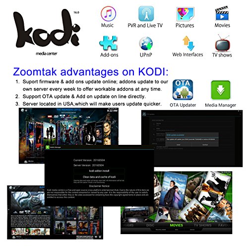 -. Feature : Zoomtak T8PLUS--2016 Hot Selling Streaming Media Player with Android 4.4 Kitkat OS,Powered by Amlogic S812 Quad Core Cortex A9 Up to 2.0GHz Chipset.Octa-Core Mali-450 3D GPU Graphics Processor.configure with 2GB RAM,16GB eMMC, 802.11 a/b/g/n dual band wifi,Zoomtak NEW unique ALL Aluminum Housing.Support 4K Streaming Movies .Enjoy truly unlimited options and completely customize your HD viewing experience with Preinstall KODI 16.1,Facebook,Youtube,Netflix,Google Plays tore and more apps / TRANSFORM YOUR TV INTO A SMART TV INSTANTLY with Zoomtak T8plus--Enjoy Unlimited Movies, TV Shows, Music, Sports and more with No Contracts and No Monthly Fees! Say goodbye to high cable bills and put your money back into your pocket, Watch Everything what you want.Browse the web,Play games,Skype video chat with friends and family on social media across the world.Install millions of apps from Google Play Store and Zoomtak APP Store.All demands at your fingertips. / HOW TO SETTING? SO EASY!!!-- Plug-in power,HDMI or RCA ,Ethernet Cable>>>Follow the wizard to setup the language,screen size and connneting internet(WIFI or Ethernet)>>>From home page select APPS>MEDIA MANAGER>select KODI Addon install>click OK(DO NOT EXIT THIS PROCESS ONCE IT HAS STARTED TO DOWNLOAD)>>>go back to home page and select KODI media center>>>Enjoy Unlimited Movies, TV Shows, Music, Sport with Fully Loaded KODI. All you need is a High Speed internet connection and an HD TV. / ZOOMTAK MEDIA MANAGER APP--This is a unique app only work on Zoomtak android tv box to ensures that you have the latest and greatest WORKING add-ons in KODI at anytime,We will Update the addons from server in usa,when we find great addons,and also delete the no working addons by Media Manager timelessly.what you only need to do is that enter MEDIA MANAGER and One click updater button then your KODI is operating like all new!!So our KODI is Fully Loaded with latest and greatest at any time. / SMALL BOX, AMAZING ENERGY--Zoomtak P.R.Ivate Unique Metal Casing with Low noise and low heat for long life expectancy,Watch your 4K streams in the most stunning visual quality! Imagine sitting down, turning on your television and watching any movie, TV show or sporting event on demand without paying a dollar for it.That's exactly what you will get with the Zoomtak T8plus Android TV Box! Make this dream a reality today!