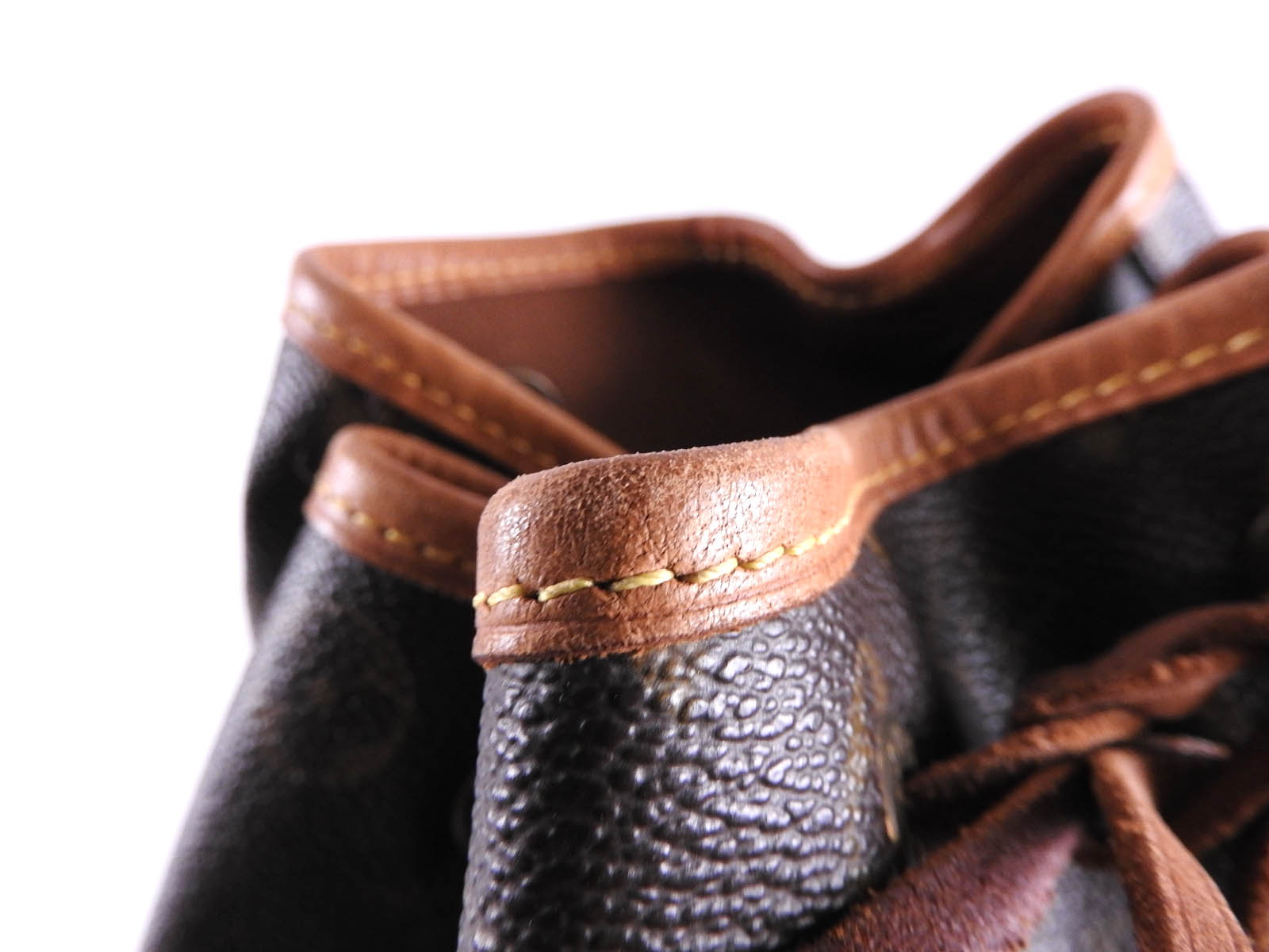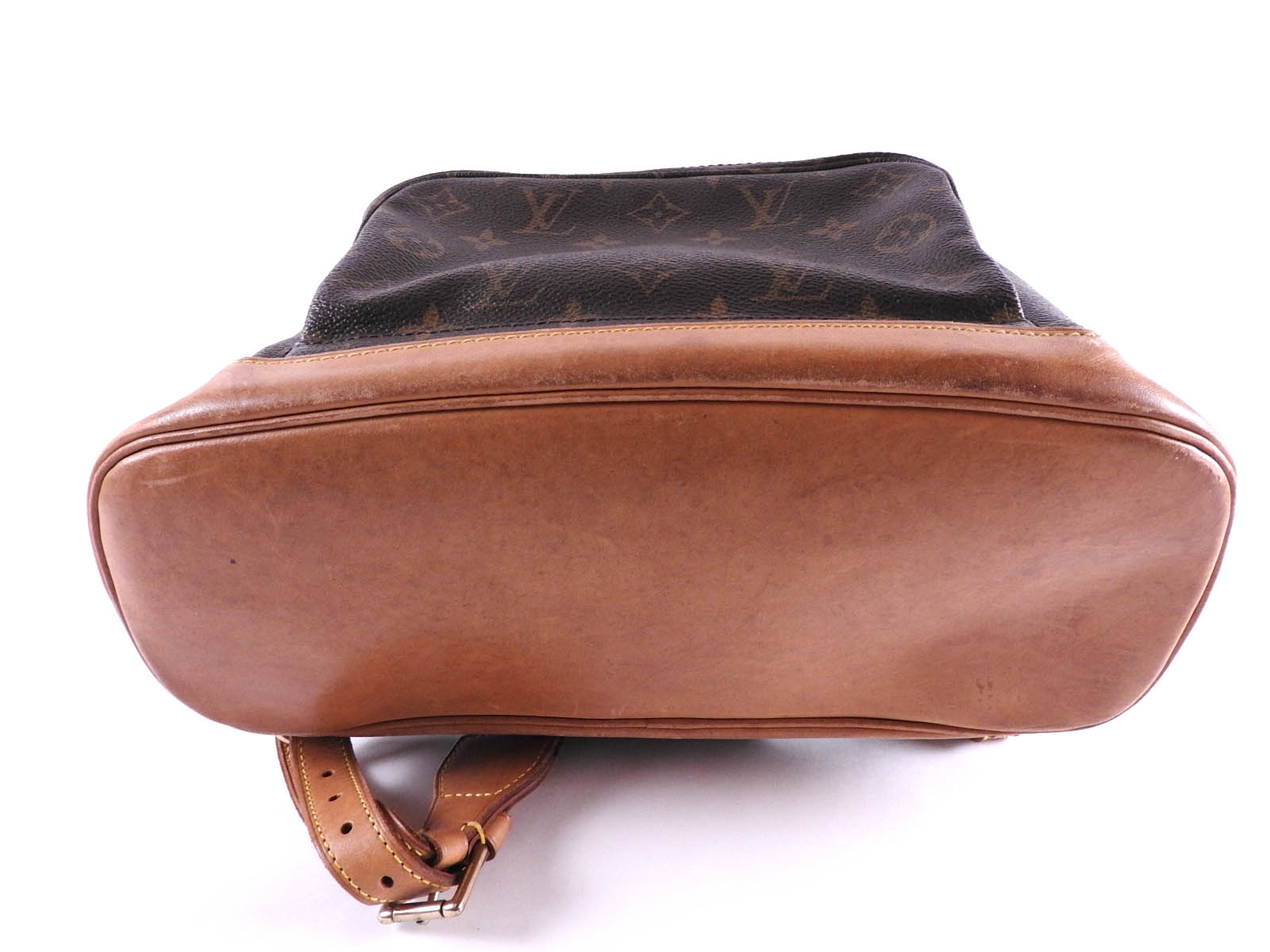Monogram: Used feeling. Slightly stained and wrinkled. Leather: Used feeling. Tanned. Some scratches, stains, wrinkles and abrasions. |