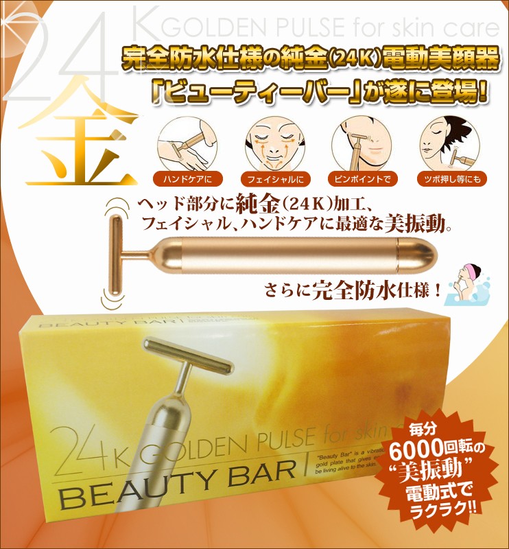 純金パワー、スキンケアには欠かせない適度な刺激を作り出す毎分6000回転の“美”振動とその振動から生まれるマイナスイオン…「ビューティーバー」はその相乗パワーで、イキイキとした、そして潤いに満ちたしっとり素肌美へと導きます。【3個セット】【正規品】【日本製】*送料無料*代引無料* ◎ビューティーバー3個セット◎浴室で使える防水構造の24金と6000回転の美振動器BEAUTY BAR【海外発送OK】