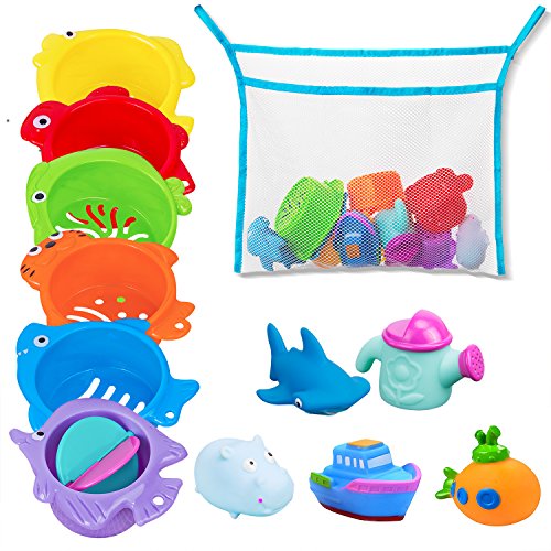 All in one set - 12 pack bath toy set include 6 multi-size stacking cups, 2 animals (fish, pig), 2 crafts ( boat, yellow submarine), 1 watering can toy, 1 bath toys organizer. Enjoy fun bath time!