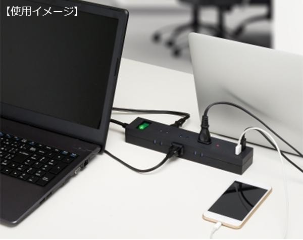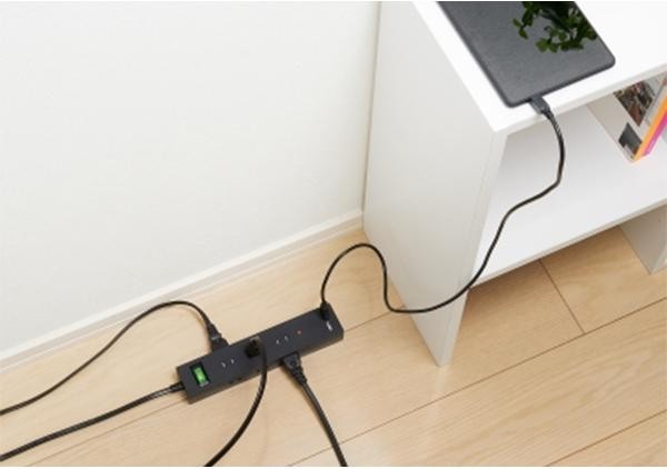 | 3方向に合計9個のコンセント差込口と、合計3.4AのUSBポートが2つ付いた電源タップ。ホコリの侵入を防止する安全シャッターや、ホコリや湿気によって発生するトラッキング火災を予防する絶縁カバーも付いています。さらに、電源を一括でON/OFFできるブレーカー機能も搭載。 |