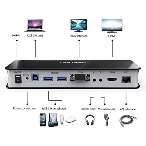 UNITEK USB3.0 Multi-function HDMI(19Pin Female)+ VGA (15Pin Female)+ Audio(2 x 3.5mm Stereo mini Jack 2.1ch)+ RJ45 + 2*USB3.0 Hub Docking Station