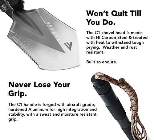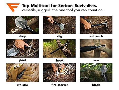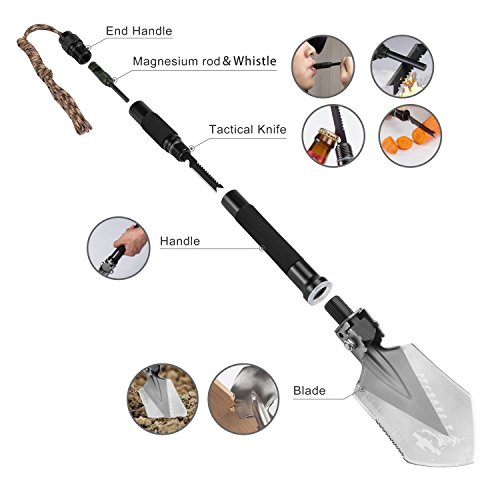 ⚒ ALL-IN-ONE SURVIVAL TOOL - Heavy Duty Shovel, Sharp Axe Blade, Serrated Saw Edge, Hammer, Paracord...Check! We’ve got all the must-haves for surviving in the outdoors covered. Conveniently dig trenches with this versatile multifunctional tool with a hidden rescue knife and saw, emergency whistle, fire starter (magnesium rod), bottle opener, and more!