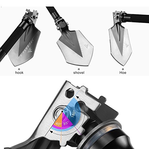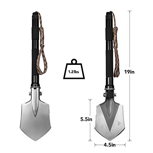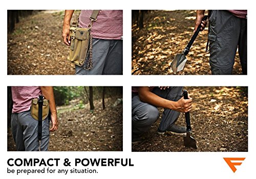⛺ COMPACT, PORTABLE MULTI TOOL - Lightweight (only 1.2lbs), and amazingly compact, this is an essential gadget to add to your outdoor first aid survival kit/ gear. Easily fit this foldable entrenching tool in your backpack, or the trunk of your vehicle. Dig your car tires out of snow, mud, or ice, or use the shovel head as a glass breaker in an emergency. Attach the included carrying case to your belt for convenient access while on the trail or hunt.