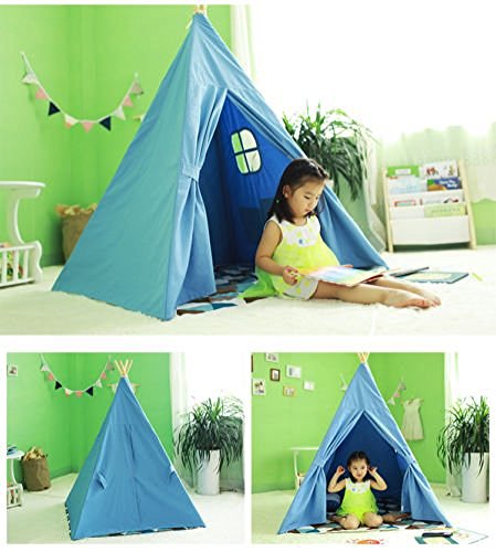 This kids teepee tent is a fun and stylish way to foster the imagination and creativity of your little ones. This teepee tents are designed to fit with your home's decor while meeting your kid's needs for adventure. This kids teepee is a great addition to a kid's bedroom, playroom, or family room. Your kid will enjoy their new personal hideaway-from the colorful canvas fabric to peek-a-boo window to the Velcro closures designed for little hands to the flap ties for keeping the teepee open. Your child will be able to go back in time and recreate history while enjoying hours of fun and creative play with our 6' canvas teepee. Measures 48" x 48" x 72" tall.