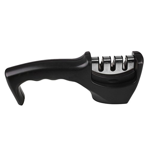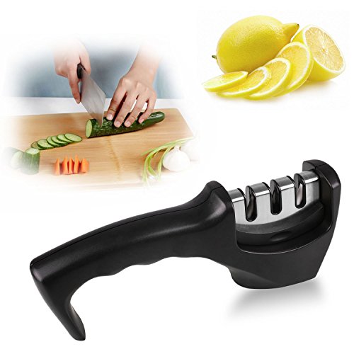 Kicode Knife Sharpener, kitchen Knife Sharpening with 3 Stages: Emery, Wolfram Steel, Ceramic Notch for Sharpening Straight Blades from Blunt to Razor Sharp (Black)