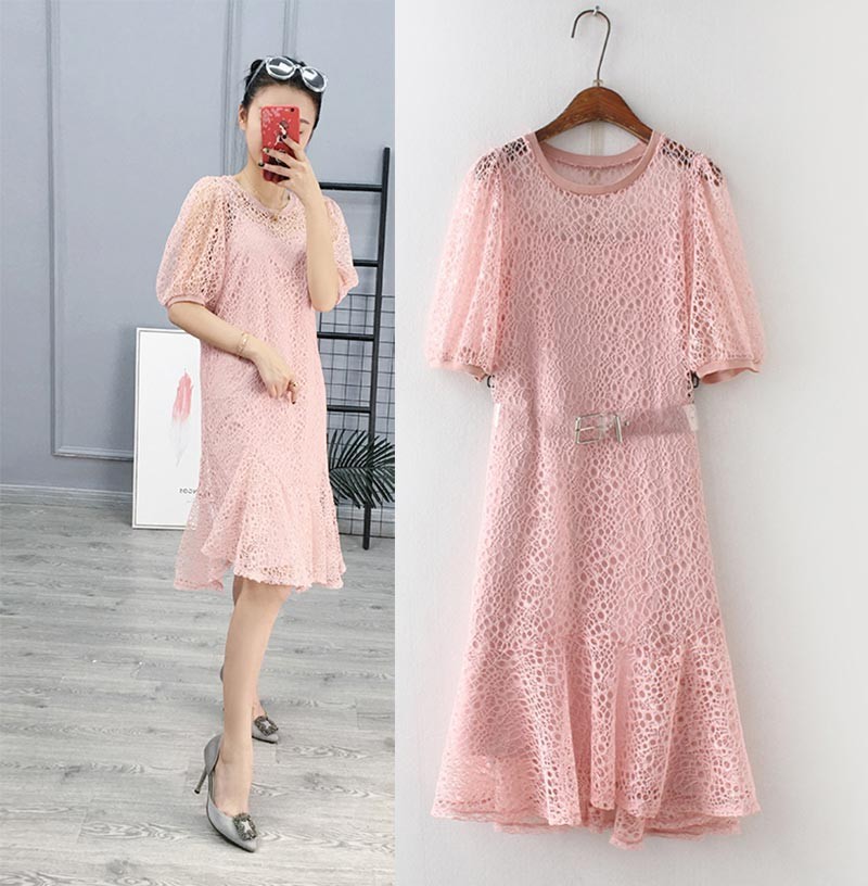ラウンドネックで5分丈のパフスリーブ・裾は切り替えフレアスカートデザイン☆