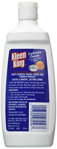 -. Binding : Health and Beauty -. Brand : Kleen-King -. EAN : 0017500030567 -. Feature : 14 oz. / Liquid / Removes tarnish, heat and food stains with chemical action / Also removes hard water stains and mineral deposits / Anti-tarnish formula keeps copper brighter, longer -. Label : Faultless/Bon Ami Co -. Manufacturer : Faultless/Bon Ami Co -. MPN : 03056 -. PackageQuantity : 1 -. PartNumber : 03056 -. ProductGroup : Health and Beauty -. ProductTypeName : HEALTH_PERSONAL_CARE -. Publisher : Faultless/Bon Ami Co -. Studio : Faultless/Bon Ami Co -. Title : COOKWARE CLEANER14OZ by KLEEN KING MfrPartNo 03056 -. UPC : 017500030567