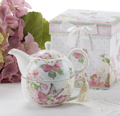 -. Feature : Porcelain tea for one tea pot with matching keepsake gift box / Tea pot sits on top of cup! / Tea pot measures approx. 6 inch tall / Butterfly design continuous around teapot