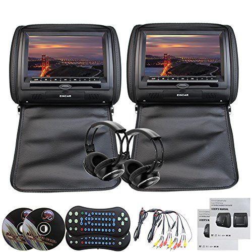 -. Feature : 9 Inch Black Digital Wide Screen Pair of Pillow Headrest Monitor comes with Pair of Infrared Headphones / Multi-region Free DVD Player in each headrest, compatible with DVD, DVDR/W, CD, CDR/W, VCD, MP3, MP4, WMA, jPEG. / Support IR FM frequency modulation transmit, Rear passengers can use the wireless headphones vir IR function & front passengers can still listen to the radio or music. / Support 32 bit games,and you can enjoy your journey. / Support Remote Control Function, Support USB & SD Card, Built-in Speaker Function.