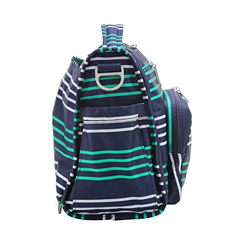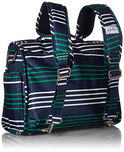 The Ju-Ju-Be Coastal Collection B.F.F. Convertible Diaper Bag provides multiple carrying and storage options to help you stay ultra-organized. Just like your B.F.F., this machine washable backpack is something you cannot live without. Designed with convenience and comfort in mind, this versatile bag can be carried using its top handle, over-the-shoulder strap or backpack straps. The memory foam straps have textured fabric underneath to prevent the bag from slipping off your shoulder. Keep organized and sane, while never sacrificing looking good. The bag's lining is protected with Agion natural antimicrobial treatment, which inhibits and reduces the growth of odor-causing bacteria, mold and mildew. The outer fabric is treated with Teflon fabric protector, so you can repel stains and keep it clean. The front "mommy" zippered pocket is large enough for smartphones, wallets, keys attach to the key fob stretch cord, and other personal items. Inside organization includes (4) gusseted pockets, (3) zippered pockets and lots of wide open space. The main zippered pocket is large enough for diapers, wipes, extra clothes and other items. The back pocket is designed with crumb drains to keep this area clean, is large enough to store your child's books, and includes a super cushy matching memory foam changing pad. Bottle pockets are located on either side of the bag and come insulated with Thinsulate by 3M to keep your items hot or cold. The Providence print is green and white stripes on a navy background with navy dachshunds with white striped sweaters on a green background for the lining. The print is accented by silver, metal hardware. With the B.F.F. Diaper Bag, you can choose to wear it as a backpack or messenger style - it's your choice. All Ju-Ju-Be Bags come with a Lifetime Limited Warranty against manufacturing defects when purchased from an Authorized Ju-Ju-Be Dealer. Authorized Dealers can be found in the images.Feature