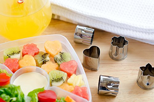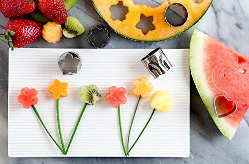 Studio : StarPack Home Publisher : StarPack Home Product Description CREATE FUN MINI FRUIT AND VEGETABLE SHAPES TO CONVINCE THE PICKIEST OF EATERS!--- This set contains 5 adorable mini cutter shapes, perfect for cutting through slices of carrot, kiwi, watermelon, zucchini, cucumber and so much more! Perfect for kids lunch boxes, bent box lunches as well as party food platters and cocktail garnishes --- ALSO MAKES THE BEST MINIATURE COOKIES! Just roll out cookie dough, and cut out shapes as with regular size cookie cutters. --- SET CONTAINS ? 5 x Mini food cutters ? 4 different flower shapes and 1 heart shape --- SIZE ? Each cutter measures approx. 1 inch in diameter x 1 inch high --- EASY TO CLEAN ? Stainless Steel --- Get yours now by clicking the orange ADD TO CART button and start making mealtimes and parties more fun! 0