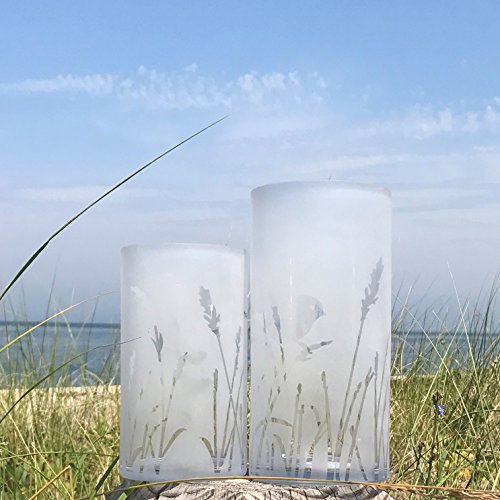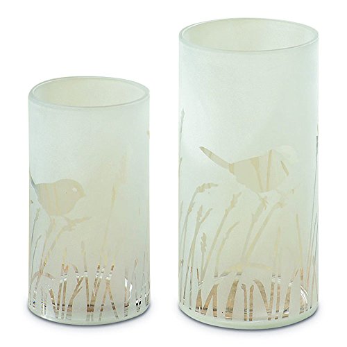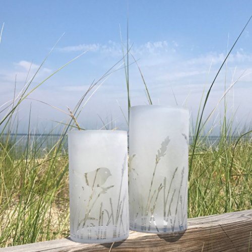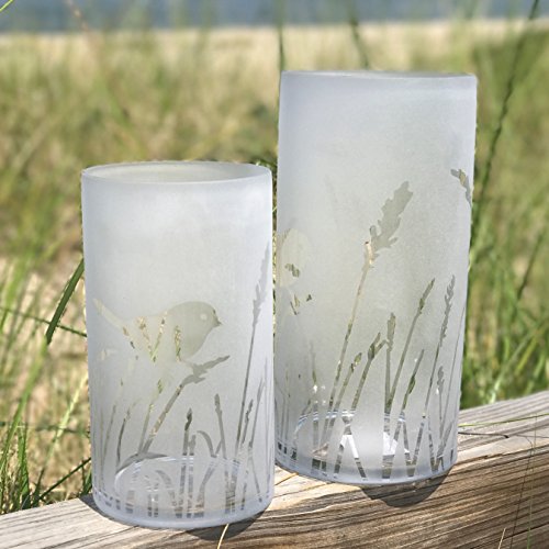 The Cape Cod Birds and Grasses Hurricane Candle Vases, Set of 2, Frosted White, Art Glass, Made By Hand, Mold Blown, 9 3/4 and 7 3/4 Inches Tall, By Whole House Worlds