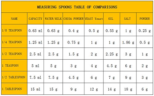 Package Includes: 1 Tablespoon (15ml) 1 Teaspoon (5ml) 1/2 Tablespoon (7.5ml) 1/2 Teaspoon(2.5ml) 1/4 Teaspoon(1.25ml) 1/8 Teaspoon(0.63ml) 0