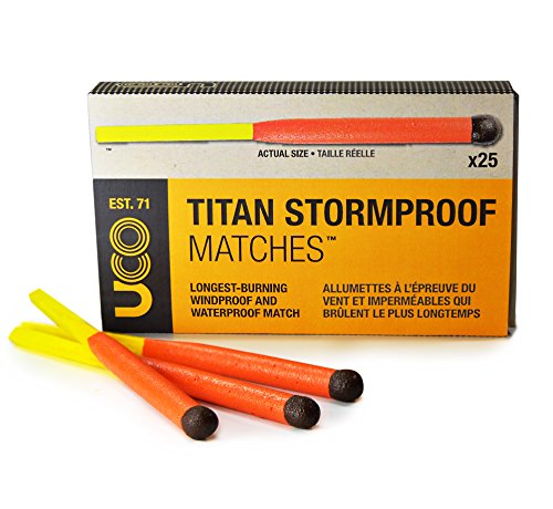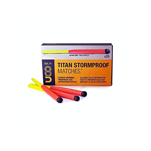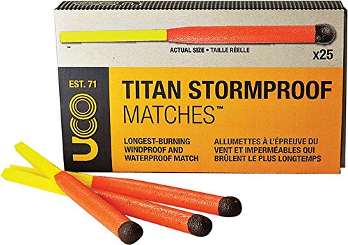 Studio : UCO Publisher : UCO Binding : Misc. Product Description With UCO Titan Stormproof Matches you're ready to conquer any conditions. They're the beefiest, longest-burning windproof and waterproof matches available. At over four inches long, they're ideal for lighting campfires and gas grills. They have a burn time of up to 25 seconds and will fire up in the harshest of conditions. They'll even relight after being submerged in water. Each box includes 25 matches plus two extra strikers.Match length: 4.125" (10.5 cm)..Weight: 3.3 oz. (94 g).. 0