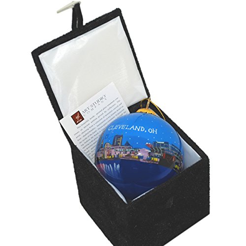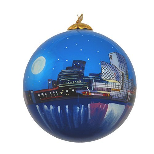 Artist rendering of Cleveland Night skyline: Spin this ornament 360 degrees to view the city shoreline shining with the radiant architecture from the Rock N Roll hall of fame to the Great Lakes Science Center.