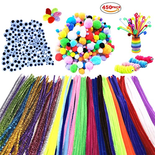 INCREDIBLE VALUE: This Art Craft Supplies kit abounds with a selection of 4 different DIY creative crafts, Includes 140 pieces pipe cleaners, 60 pieces glitter pipe cleaners, 150 pieces self-sticking wiggle eyes, 100 pieces pompoms. All your need for Chenille Stem craft are included.