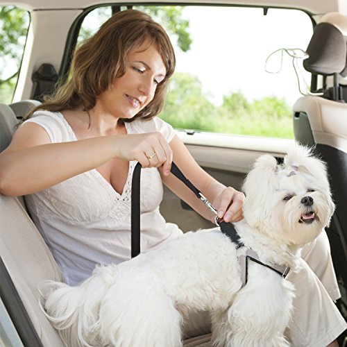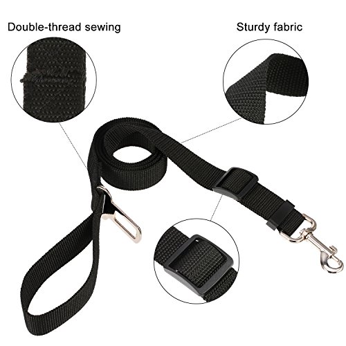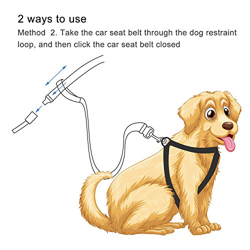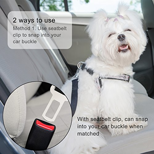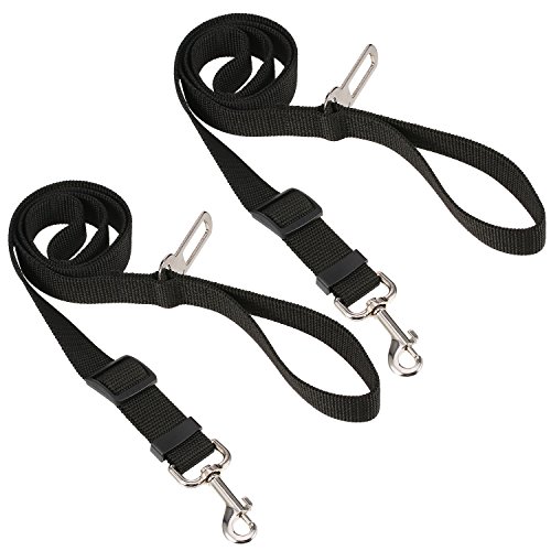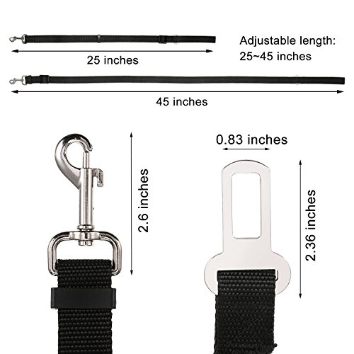 2 Pack pet seat belt harness with?seatbelt clip and restraint loop It's made of quality nylon fabric to ensure safety, features the solid metal swivel snap and metal seatbelt clip to guarantee durability. 2 Different ways to fix the pet safety leash on the car: 1. Use seatbelt clip on the dog car seatbelt harness to snap into your car buckle when they are matched. 2. Take the car seat belt through the dog restraint loop, and then click the car seat belt closed.? Use tangle-free swivel piece: Trigger hook can rotate freely with 360 degree rotation, prevents pups from getting twisted or caught up in their pet seatbelt tether, designed for dogs who can't sit still. Adjustable dog safety leash: Keep your pet out of your lap and safely restrained in car back seat; You can adjust the tether's length according to the size of your dog; One seat belt fit for most of dogs. Also can be as traffic handle dog leash: With 15 cm/ 5.9 inch long handle loop, you can enjoy walking with your dog and keep your dog right by your side at the same time, works great for street crossings, busy streets, etc. Warm notice:? 1. Inspect attachment for wear or abrasion and do not use if seat belt is compromised or damaged in any way.? 2. The tab on the seat belt clip is 2.1 cm, please check your car buckle's size and compatibility before purchase. 3. Take the car seat belt through the dog restraint loop and click the car seat belt closed when the seat belt clip is not compatible with your car buckle. Specification: Material: nylon, metal Color: black Nylon belt width: 2.5 cm Package includes: 2 x Dog seat belt harness 0