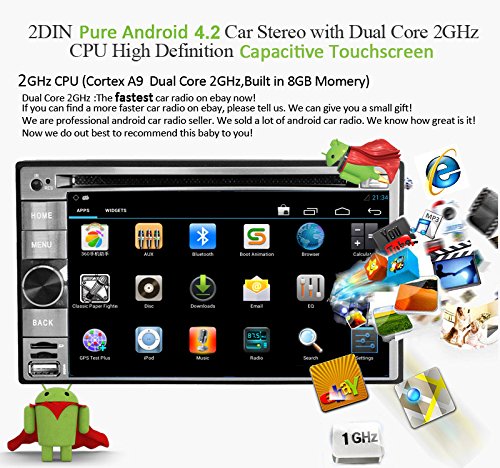 Pure Android 4.2, 3D GPS Navigation, Dual Core CPU, It fast processing system and huge space will give you an unprecedented experience when you use GPS, play game and watch video etc. The Double din car dvd player support built-in WIFI to surf the INTERNET, you can go to Android Market download thousands of apps & games: Facebook, YouTube, Gmail...(3G Internet is optional feature, please contact us before order if you need it .)