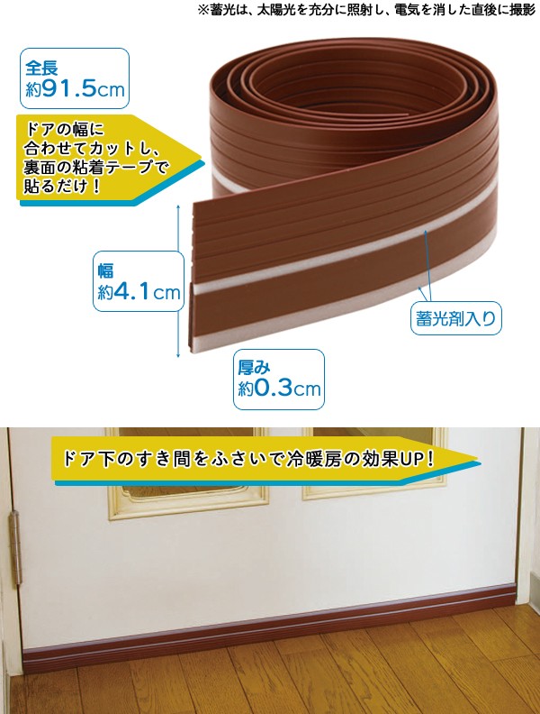 | ドア下の隙間をふさぐ蓄光入りのテープです。冬はすきま風を防いで、夏はエアコンの冷気を逃さず、オールシーズンご使用いただけます。ホコリや花粉の侵入防止にも!ドアの幅に合わせてカットし、裏面の粘着シールで貼るだけなので取り付けも簡単です。蓄光ライン入りで暗闇でほのかに光り、ドアの位置が分かりやすい!すきまテープ/すき間テープ/すきま風/隙間/スキマ/ドア/扉/蓄光タイプ/空調効率アップ/ブラウン |