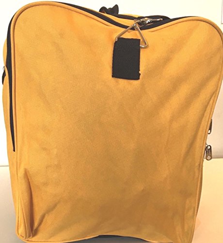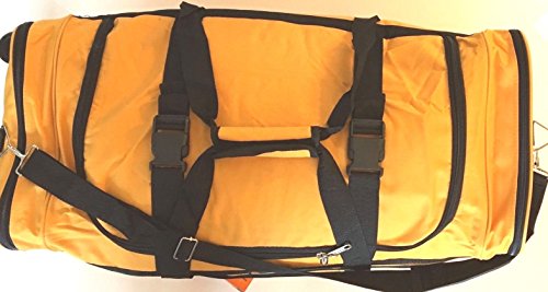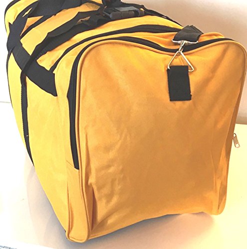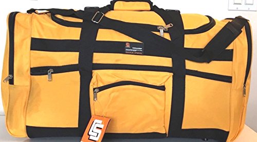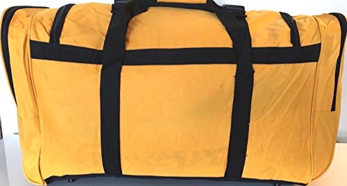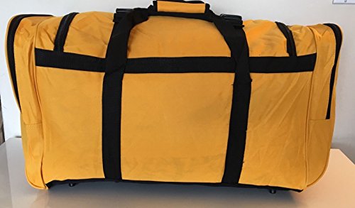 Product Description NEW YELLOW WITH BLACK TRIM 28" 50LB CAPACITY DUFFLE BAG / LUGGAGE / SUITCASE. EXCELLENT QUALITY 28" DUFFLE BAG. FEATURES RUGGED 600 DENIER NYLON FABRIC. ONE OF A KIND ROYAL BLUE AND BLACK COLOR. REINFORCED CARRY HANDLE, ADJUSTABLE SHOULDER STRAP. TWO DOUBLE ZIPPERED SIDE POCKETS MAKES 4 COMPARTMENTS FOR EXTRA ITEMS, 2 POCKETS MEASURE 8" X 9"X 1" DEEP AND 2 MEASURE 7" X 9" X 1" DEEP. 2 LARGE ZIPPERED END COMPARTMENTS MEASURE 12 1/2" WIDE X 14 1/2" HIGH X 2 1/2" DEEP EACH SIDE. MAIN COMPARTMENT IS 23" LONG X 14 1/2" DEEP X 12 1/2" WIDE. TOTAL LENGTH IS 28". WEIGHS 46 OZ EMPTY 0