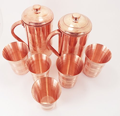 -. Brand : Dorpmarket -. Color : Copper -. EAN : 0640793941922 -. Feature : Quantity -2 Pcs Jug and 5 Pcs Glass / Diameter Of Jug -4" ( inch ) , Height Of The Jug - 8.5" (inch) , Glass Height - 4" (inch), Glass Diameter- 3" (inch) / Indian Ayurveda Copper Water Jug Pitcher / Materials - 100% Pure Copper and 100% Hand made / This handmade copper pitcher measures 4.5 inches in diameter and 8.5 inches in height. Enjoy the same delicious and pure water with this copper pitcher. A perfect gift for friends and family. This will hold 50 Fl. Oz or 1.5 liters According to Ayurveda, Water stored overnight in the copper pitcher has rejuvenating and purifying properties.The Anti- Bacterial / Microbial Properties of copper vessels have also been scientifically proven by researchers. -. Label : Dorpmarket -. Manufacturer : Dorpmarket -. Model : 4-L -. MPN : 4-L -. PackageQuantity : 7 -. PartNumber : 4-L -. ProductGroup : Kitchen -. ProductTypeName : KITCHEN -. Publisher : Dorpmarket -. Size : 8.5" X 4" -. Studio : Dorpmarket -. Title : Indian Ayurveda Copper Water Jug Pitcher Copper 5 Glasses with 2 Pitcher Jugs Set for Storing Drinking Water Ayurveda -. UPC : 640793941922