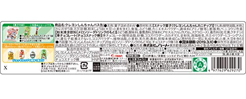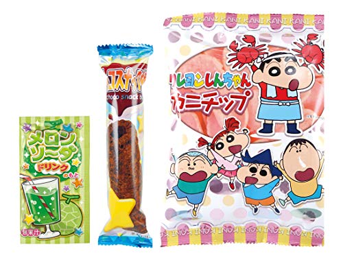 原材料:【スナック菓子(クレヨンしんちゃんカニチップ)】でん粉、植物油脂、米粉、かにのすり身、えび、砂糖、粉末しょう油(大豆・小麦を含む)、食塩、ぶどう糖、カニエキスパウダー、調味料(アミノ酸等)、膨脹剤、ベニコウジ色素【粉末清涼飲料(メロンソーダドリンクのもと)】ぶどう糖、酸味料、重曹、香料、甘味料(アセスルファムカリウム、スクラロース)、着色料(紅花黄、クチナシ)【準チョコレート(チョコスナック棒)】準チョコレート(植物油脂、砂糖、ココアパウダー、カカオマス、全粉乳、脱脂粉乳、ホエイパウダー)、コーングリッツ(遺伝子組換えでない)、ココアパウダー、植物油脂、小麦粉、乳化剤、香料、卵殻未焼成Ca、(原材料の一部に乳成分、卵、小麦、大豆を含む)