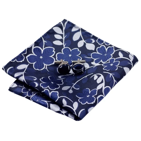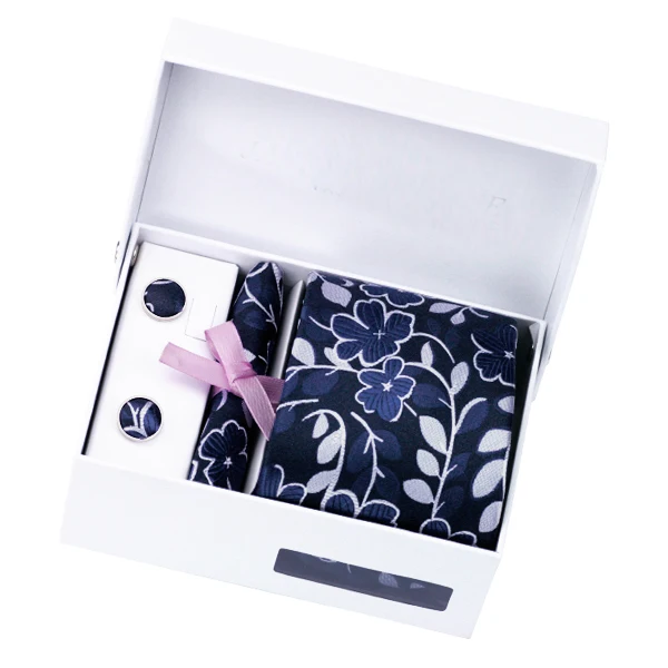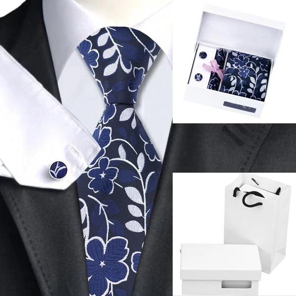 | [해외]HN-1160 다크 블루 블랙 화이트 꽃 넥타이 손수건 커프스 선물 상자 가방 세트 남성 100% 실크 넥타이 남성 웨딩 파티 신랑 |
