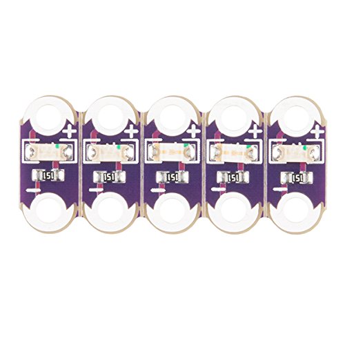 This is a simple pack of five Green LilyPad LEDs that are still attached to one another, letting you snap the LEDs apart at your leisure to sew into clothing or whatever else you can dream up.LilyPad is a wearable e-textile technology developed by Dr. Leah Buechley and cooperatively designed by Leah and SparkFun. Each LilyPad piece was creatively designed with large sew tabs to allow them to be sewn into fabric. Various input, output, power and sensor boards are available. They're even washable (with special care)!
