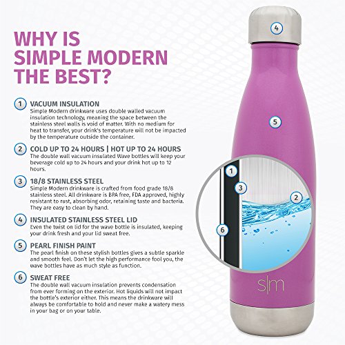-. Binding : Misc. -. Brand : Simple Modern -. Feature : ✓ VACUUM INSULATED - The double walled vacuum insulated exterior will keep your drink the same temperature as long as science will allow. / ✓ SWEAT FREE - The exterior will never sweat. Don't worry about getting water on your desk, rings on your table, or a mess in your bag! The bottle won't even be hot or cold to the touch no matter the temperature of the liquid. / ✓ FITS MOST CUP HOLDERS - The shape of this 17oz bottle will fit normal sized cup holders and the narrow mouth makes it easy to drink from on the go. / ✓ DURABLE - Made from FDA approved 18/8 stainless steel, this cola shaped bottle is ready for everyday use. / ✓ STAY COOL - Not only will you be stylish with your choice of popular colors, your drink stay cold for 24 hours or hot for up to 12 hours. -. IsAutographed : 0 -. IsMemorabilia : 0 -. Label : Simple Modern -. Manufacturer : Simple Modern -. PackageQuantity : 1 -. ProductGroup : Sports -. ProductTypeName : SPORTING_GOODS -. Publisher : Simple Modern -. Studio : Simple Modern -. Title : Simple Modern Vacuum Insulated 17oz Wave Bottle - Double Walled Stainless Steel Water Thermos - Cola Style Hydro Swell Tumbler - Compare to S'well