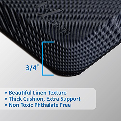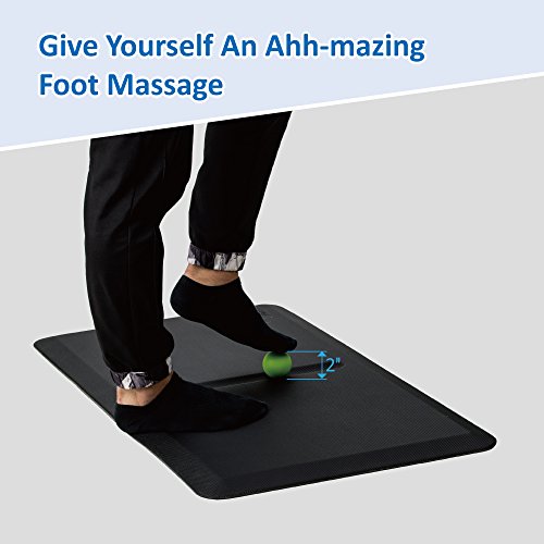- SUPERIOR DESIGN FOR COMFORT AND SAFETY: Features a 3/4 inch-thick cushion, high density core foam to provide extra soft yet steady footing support, with non-slip backing to lock the comfort mat in place; A contoured beveled-edge design to prevent accidental tripping; Premium therapy Yoga roller ball for deep tissue massage.