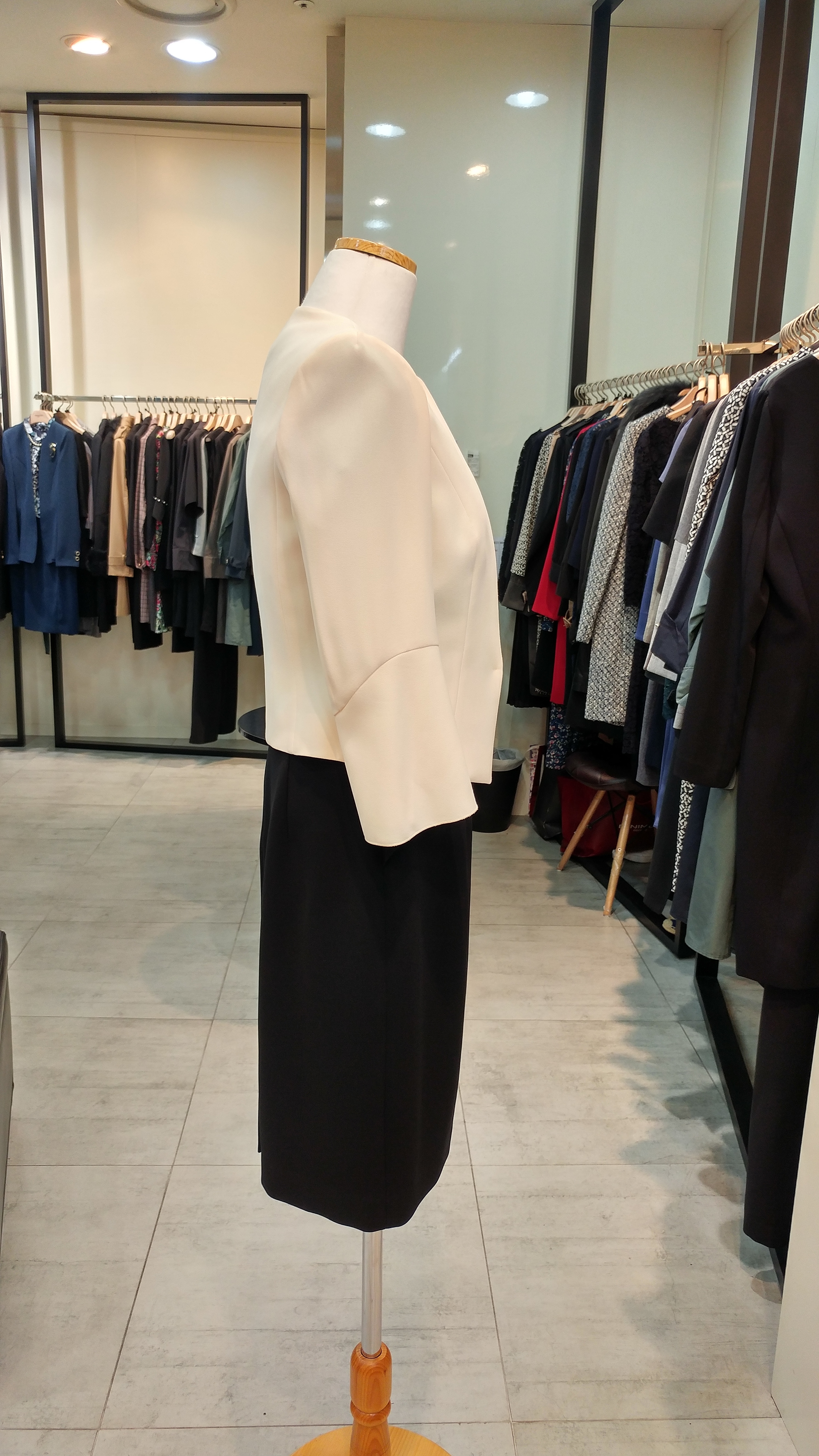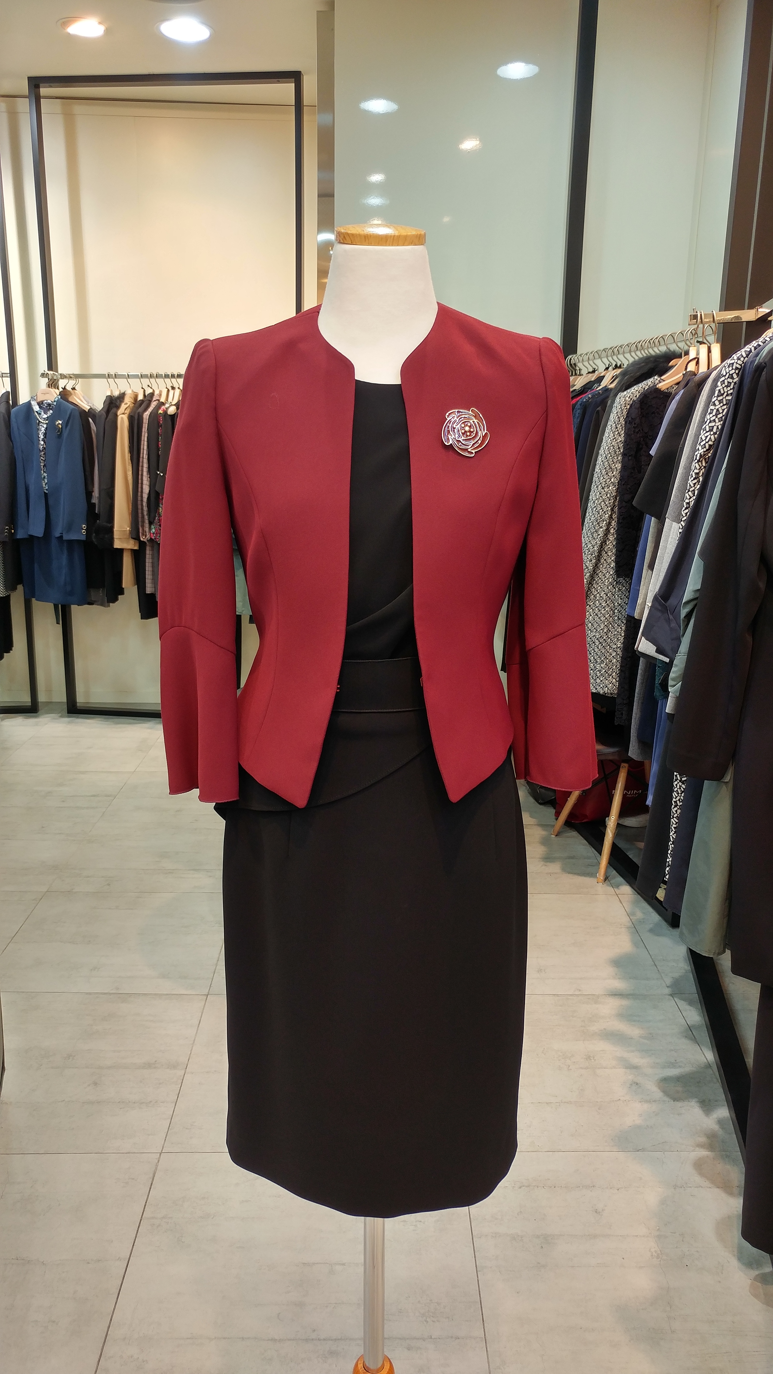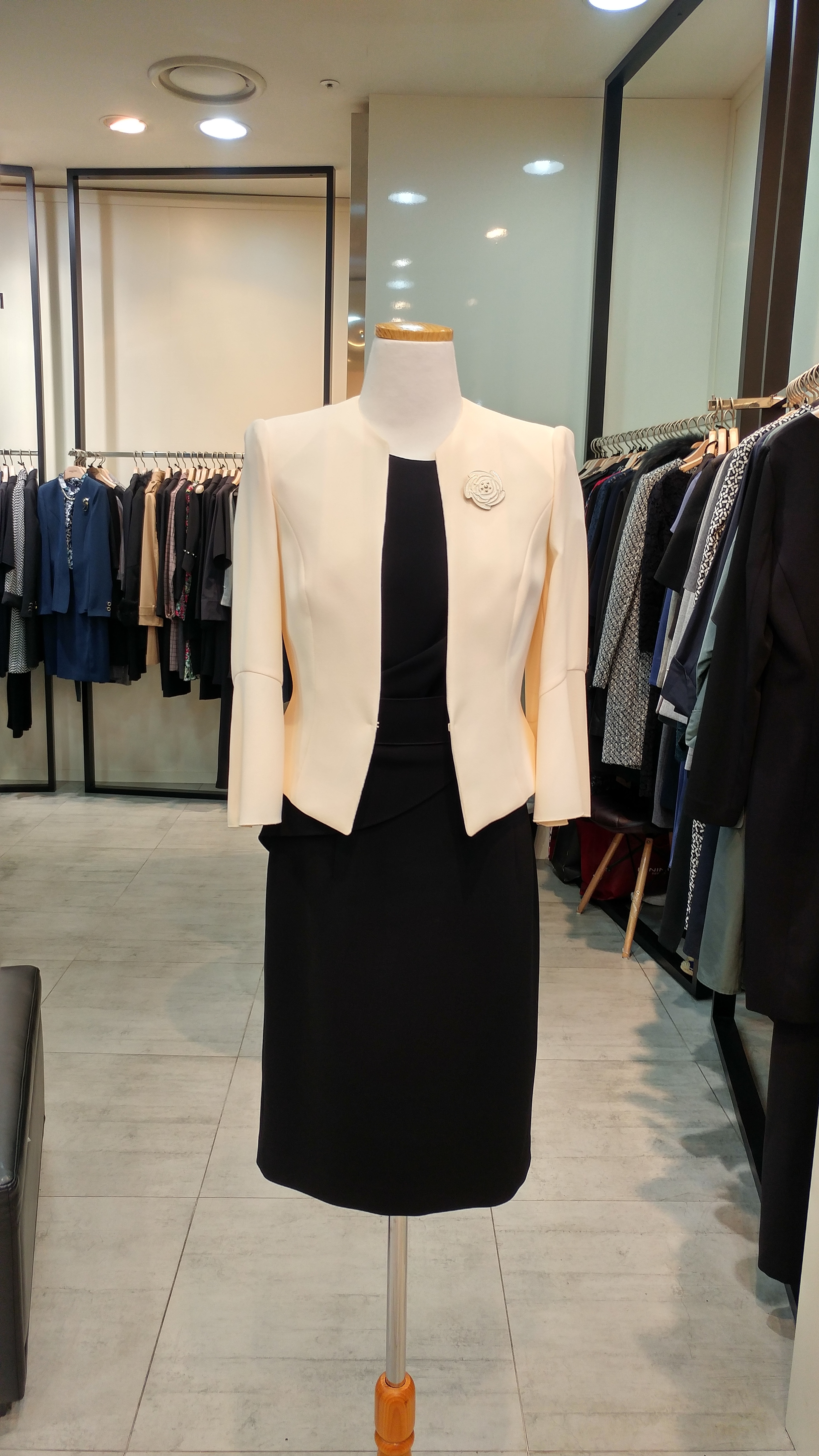 노카라숏쟈켓입니다^^ 7부벨소매와 브로치가포인트로  고급스러우며 세련미가돋보이는 스타일  총장45