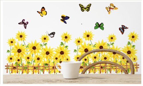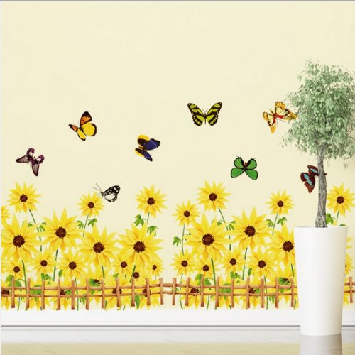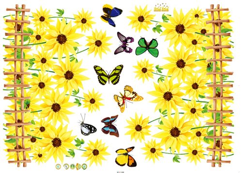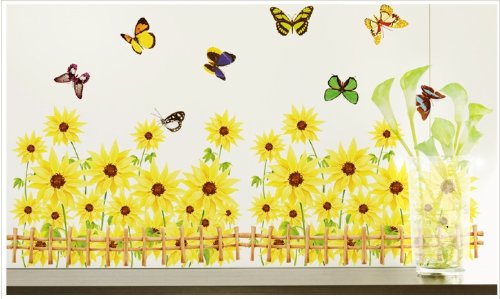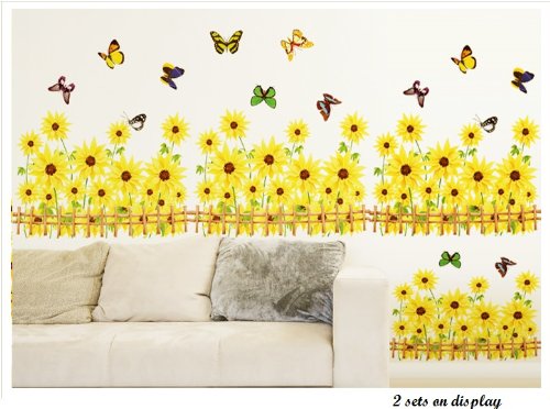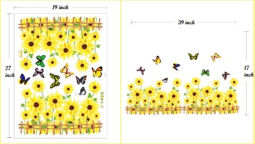 -. Feature : Includes multiple sunflowers, butterflies and fences / Applies to any smooth surface / Removable and reusable with no sticky residue / Dimension of product sheet: 19Wx27L