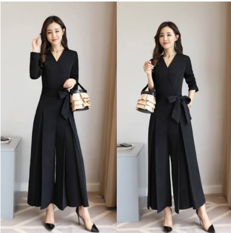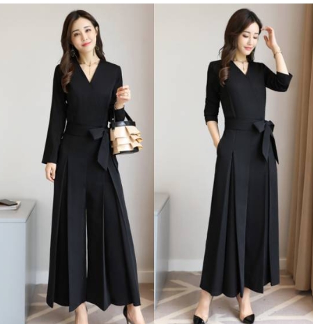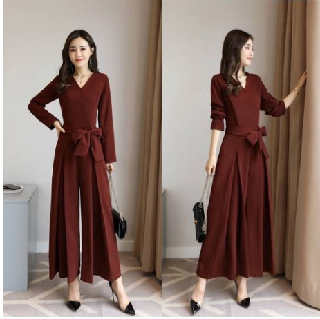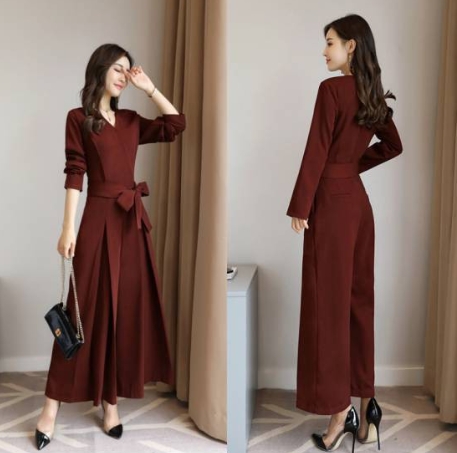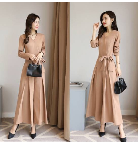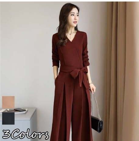 カシュクール風のVネックと、腰の高い位置でのウエストマークで、全身をスッキリ見せてくれる効果も♪