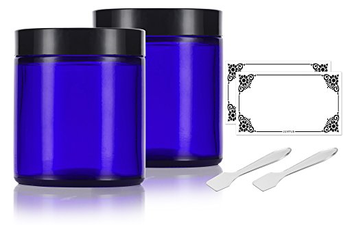 Cobalt Blue Glass Straight Sided Jars - 4 oz / 120 ml (2 pack) + Spatulas and Labels - Airtight, Smell Proof, BPA Free Lids