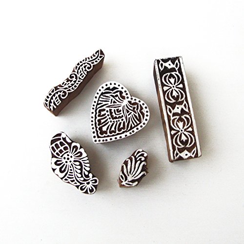 -. Title : Jaipuri Heart and Floral Designs Wood P.R.Int Blocks (Set of 5)