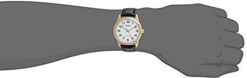 Brand, Seller, or Collection Name:Casio Model number:EAW-MTP-V001GL-7B Part Number:MTP-V001GL-7 Item Shape:Round Dial window material type:Mineral Display Type:Analog Clasp:Buckle Case material:Metal Case diameter:42 millimeters Case Thickness:8 millimeters Band Material:leather Band length:Men's Standard Band width:22 millimeters Band Color:Black Dial color:White Bezel material:Gold tone Calendar:No Special features:measures-seconds Item weight:1.44 Ounces Movement:Quartz Water resistant depth:30 Meters