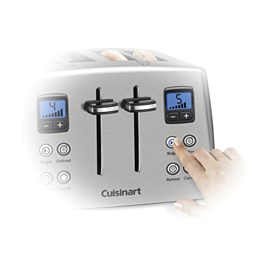 This 4-slice toaster delivers contemporary styling to suit most d?cors. Constructed of smooth brushed stainless steel, with black-accented touchpad controls, the toaster has a LCD countdown timer. The touch pad controls offer 7-shade browning selection, one-sided enhanced bagel toasting, as well as, reheat, defrost, bagel and cancel functions with LED indicators. An extra-lift carriage lever allows for easy removal of small pieces of bread. A removable crumb tray allows for quick clean ups.