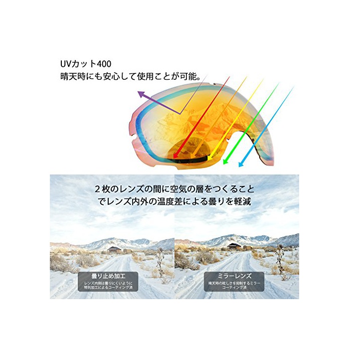 ?【기능성 이 뛰어난 렌즈】고글내의 공간을 널리 잡히는 구면 렌즈는 왜미노 적은《구리아》인 시야를 확보.렌즈와 렌즈의 사이에 공기의 층을 마련하고, 내외의 온도 차이에 의한 흐림을 경감.또한안쪽의 렌즈에는 흐림금지 가공을 하는 것에,더욱 더 쾌적성을 향상 하고 있습니다.