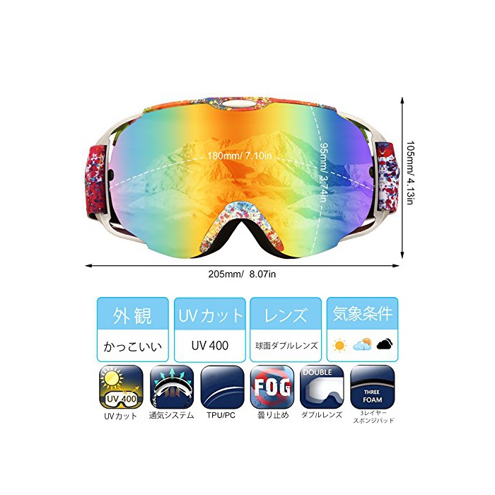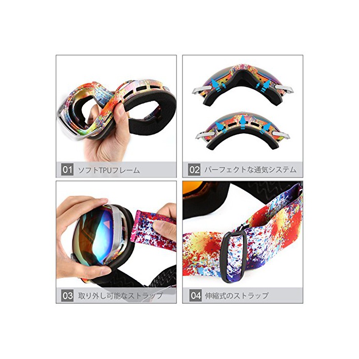 ?【쾌적한 착용】버클은 거는 것 뿐(만,만큼)으로 착용 할 수 있는 원터치 타입입니다.얼굴에 접하는 쿠션 부분은 경도가 다른 3층의 스펀지와,촉감이 좋은 플리스(fleece) 소재를 중잔 다층구조.착용시의 스트레스를 줄일 수 있습니다.조절 가능한 탄성 헤드 밴드,조정이 용이 합니다.어른용의 스키 고글은 안경의 위로부터 착용 가능한 안경 대응 모델입니다.