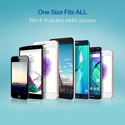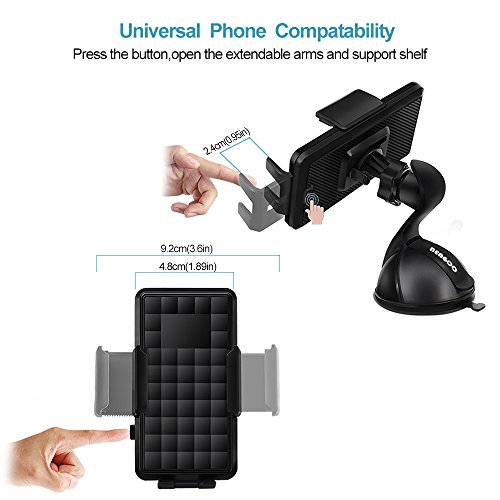 UNIVERSAL PHONE MOUNT HOLDER: Press the button and open the extendable arms(from 1.89 inches to 3.6 inches) and supported shelf(from 0.95 inches to 2.4 inches) Compatible with phone that is 4-6inches in diagonal line, which makes it suitable for almost all size phones like iPhone 7 6s Plus 6s 5s 5c Samsung Galaxy S8 Edge S7 S6 Note 5 Android IOS Mobile Phone and More.