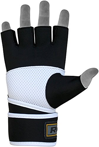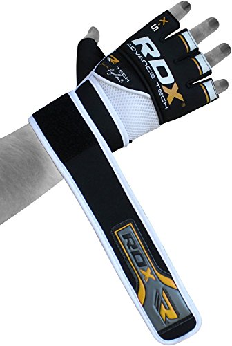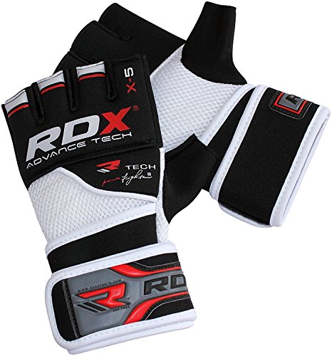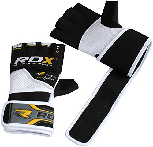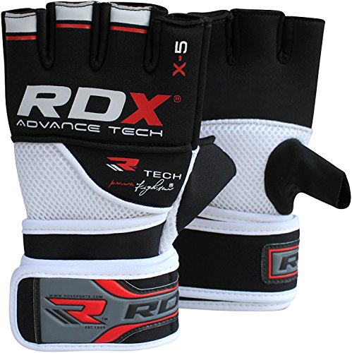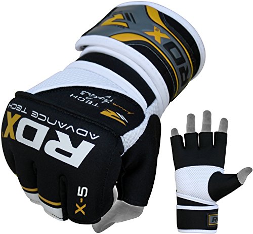 -. Binding : Misc. -. Brand : RDX -. Feature : Exclusive RDX® Power Fighter® gel-5 gloves with light gel-integrated padding provides an extra layer of defense against shock impact / Quick-EZ Velcro closure with extra-long strap provides enhanced wrist-support and a snug fit / Lightweight built with form-fitting Neoprene based NEO-I material to prevent hand cramping / Nylon-Mesh based CoolX technology for sweat-wicking and air ventilation palm-side to transport moisture away from hands / Neoprene compression material hugs hand comfortably -. IsAutographed : 0 -. IsMemorabilia : 0 -. Label : RDX -. Manufacturer : RDX -. ProductGroup : Sports -. ProductTypeName : SPORTING_GOODS -. Publisher : RDX -. Studio : RDX -. Title : RDX MMA Grappling Gloves UFC Cage Fighting Sparring Inner Glove Training X5