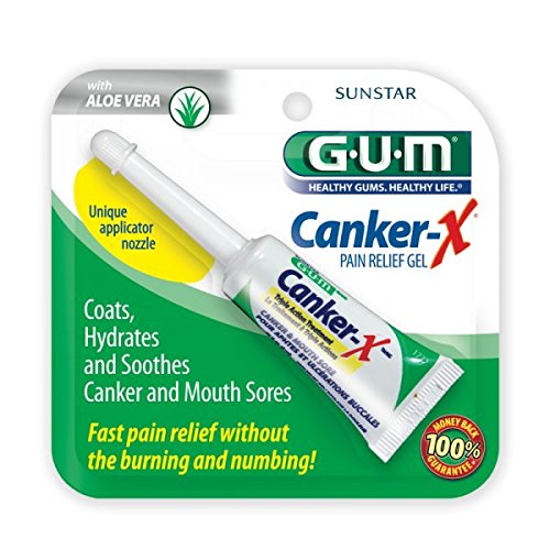 Studio : Sunstar Americas, Inc. Publisher : Sunstar Americas, Inc. Binding : Misc. Product Description GUM Canker-X gel is an aloe Vera based formulation that helps treat canker sores (also known as aphthous ulcers), mouth sores, and minor cuts or abrasions by providing a protective healing barrier. The patented triple action gel offers fast pain-relief and helps soothe the affected area without stinging or burning on application. GUM Canker-X gel is a non-prescription product without benzocaine or alcohol. Mouth ulcers are not generally a significant risk to your oral health. However, if you have severe and frequently recurring mouth sores or if they do not heal within 10 days, consult your dentist or physician. 0