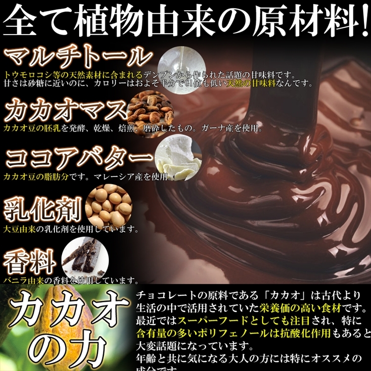 ■原材料名:マルチトール、カカオマス、ココアバター、乳化剤(大豆由来)、香料