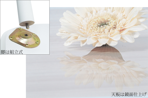 ●木目調の鏡面仕上げが美しいテーブル。ちょっとした軽食時や書き物におすすめ。