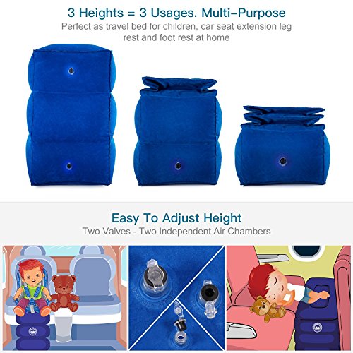 PERFECT SOLUTION FOR PARENTS TRAVELING WITH KIDS - NO MORE sleepless flights for your little ones! Instantly create a travel bed for your children to sleep on during long haul flights. Let them rest well with this easy-to-inflate, height-adjustable sleeper-pillow which fits between airplane seats and doubles as a leg rest (or footrest for adults). Compact, foldable and lightweight making it the perfect travel ottoman to use in airports while waiting for flights as well.