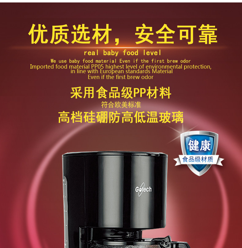 特点:家用全自动咖啡机,咖啡机采用特有全密封智能底盘全自动保温、防滴漏保护、高低温防爆咖啡壶!0.6L黄金容量,莲蓬花洒喷头调节咖啡浓淡度适合各种口味,人性化全自动设计操作简单方便,适合办公室、家用和朋友聚会,煮咖啡也可以煮茶泡茶!