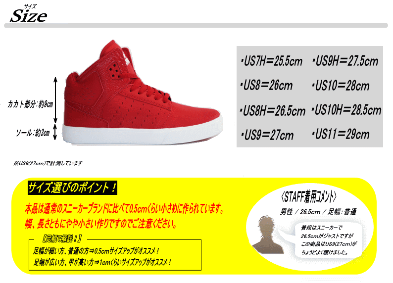 | 商品説明 | <BRAND STORY> 2006年、アメリカのカリフォルニアで誕生したスニーカーブランド。その斬新なデザイン、高い機能からリアルスケーターはもちろんのこと、数々のラッパー、DJ、アーティスト、NBAプレイヤーなど、セレブ達がこぞって愛用している事でも有名である。 <ITEM INFO> ・SUPRAのNEWモデル「ATOM」。履きやすさはもちろん、スタイリッシュなフォルムの洗練された1足です。 ▼ SUPRA製品について ▼- 必ずお読み下さい - SUPRA製品は、ブランドの特製上、ファッション性を強く意識しているが為、物によって作りが荒い物もあります。ブランド志向が強く、細部のクオリティーまでこだわる方には、あまりオススメ出来ません。縫製が荒い物、接着剤のはみ出し、アッパーの多少の汚れ、靴ヒモへの色移り、スウェードの擦れ、インソールの浮きやズレ、品質にムラがある場合が御座います。これらは、SUPRAブランドの製品の特性上の事ですので、予め、ご了承の上、お買い求め下さい。 |