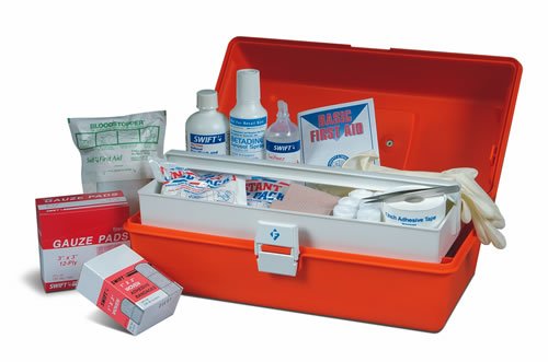 - The sports first aid kit in soft-sided, zipper front case contains all the first aid supplies