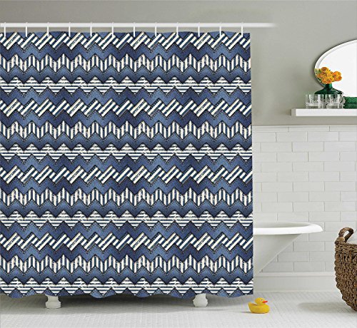Ambesonne Nautical Decor Collection, Patchwork of Denim Fabric in Nautical Style Stitch Stripes Jeans Zig Zag Chevron Image, Polyester Fabric Bathroom Shower Curtain, 84 Inches Extra Long, Navy White